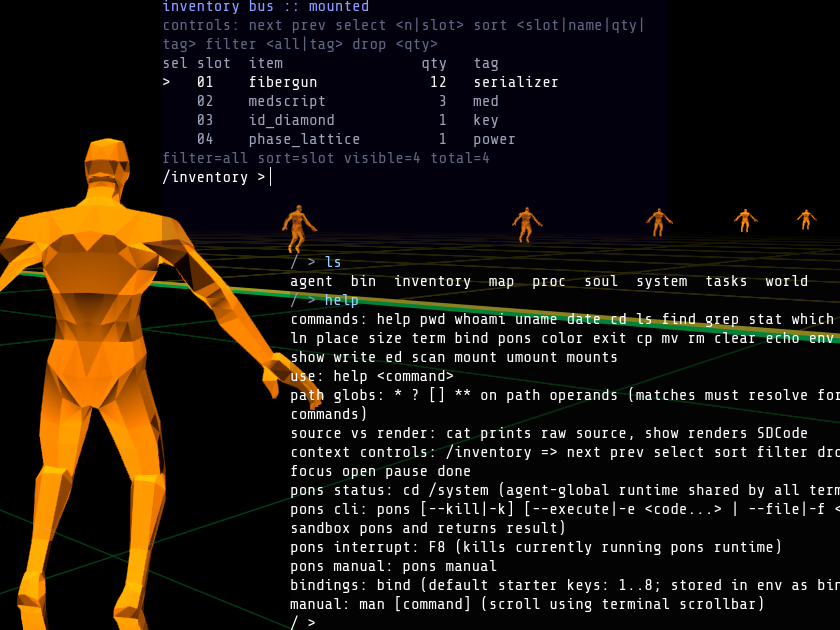 Sunrise. I am pushing the concept to its natural end. The grid is made of sec-zones. Entering a sec-zone reveals its content. It’s the equivalent of a “room”, in a MUD/MUSH. It stays what it was yesterday, an infinite map calculated both server-side and in the grid shader. An agent has its own filesystem, with…